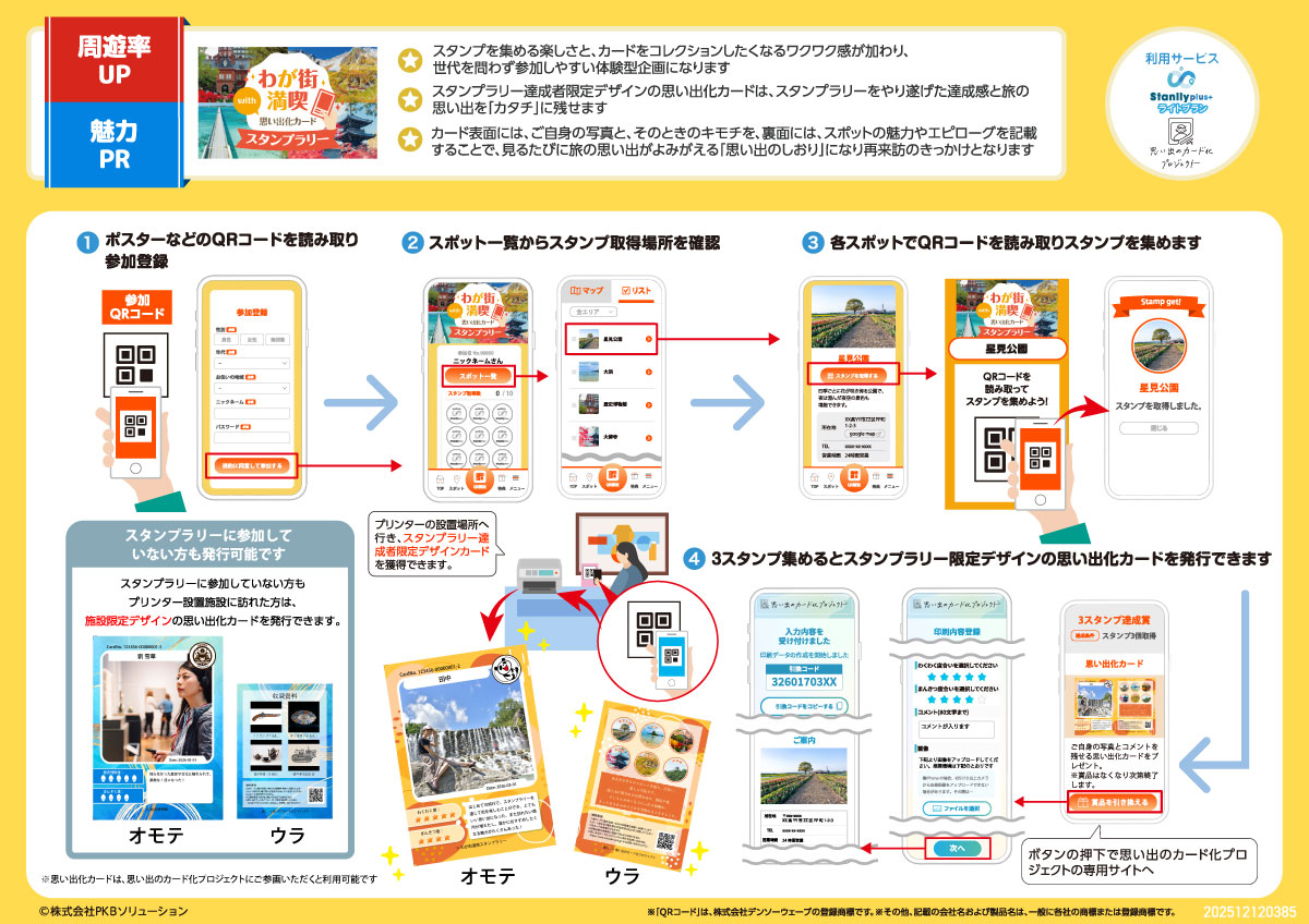 スタンプラリーを楽しみながら、思い出をカードとしてコレクションできるデジタルキャンペーンです。3スタンプ集めると限定デザインの思い出化カードが発行可能となります。カードには任意の写真とテキストを掲載でき、見るたびに旅の思い出がよみがえる「旅のしおり」として再来訪のきっかけとなります。