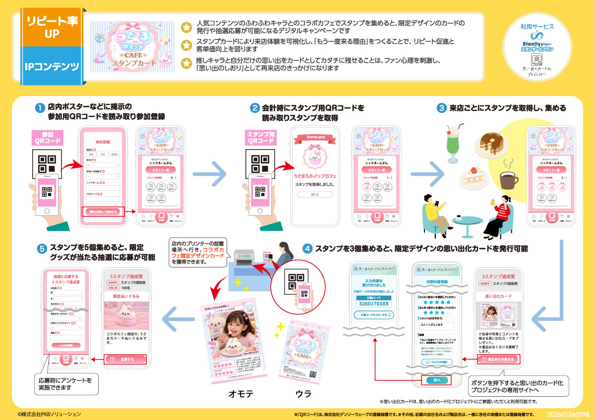 コラボカフェでスタンプを貯めると、『思い出化カード』との引換や抽選参加が可能になるデジタルスタンプカードです。人気のIPコンテンツとのコラボにより集客促進し、推しキャラがデザインされたカードは任意の写真とメッセージを記載したオンリーワンの「思い出のしおり」として再来店のきっかけになります。