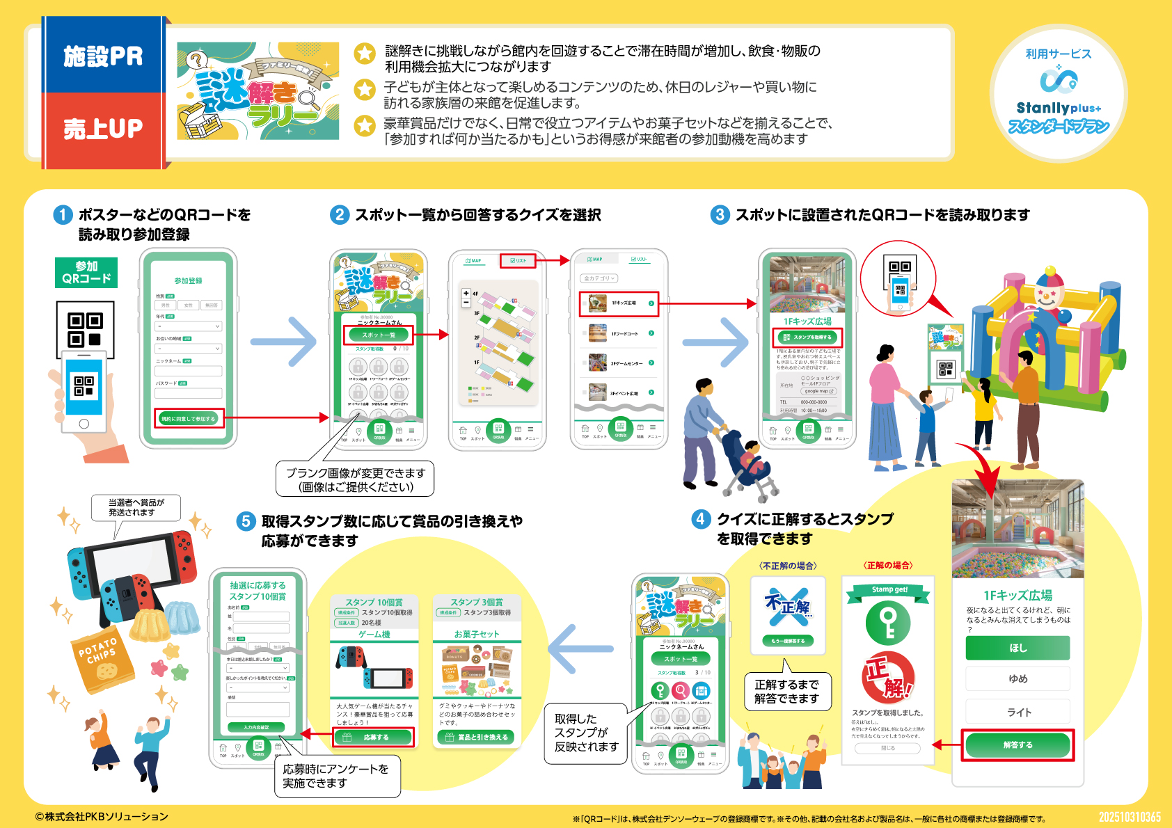 親子で謎解きを楽しみながら参加できるデジタルスタンプラリーです。子どもでも挑戦しやすい内容で、家族で協力しながら楽しく参加できます。スタンプ数に応じて賞品の応募や引き換えが可能で、豪華賞品から日常使いのアイテムまで幅広く揃えることで、家族連れの来館意欲を促します。
