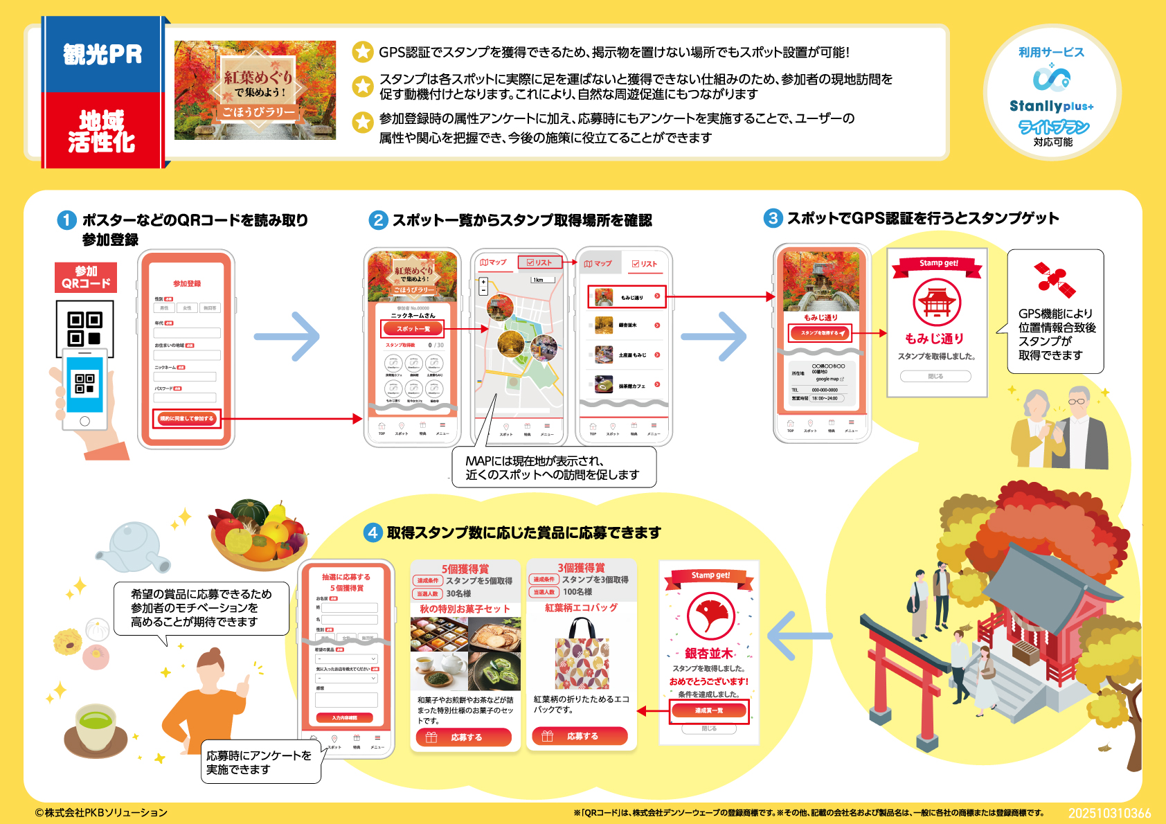 紅葉スポットを巡りながらGPS認証でスタンプを集めるデジタルスタンプラリーです。集めたスタンプ数に応じて賞品に応募でき、秋の観光シーズンにおける地域の回遊促進や観光活性化につながります。