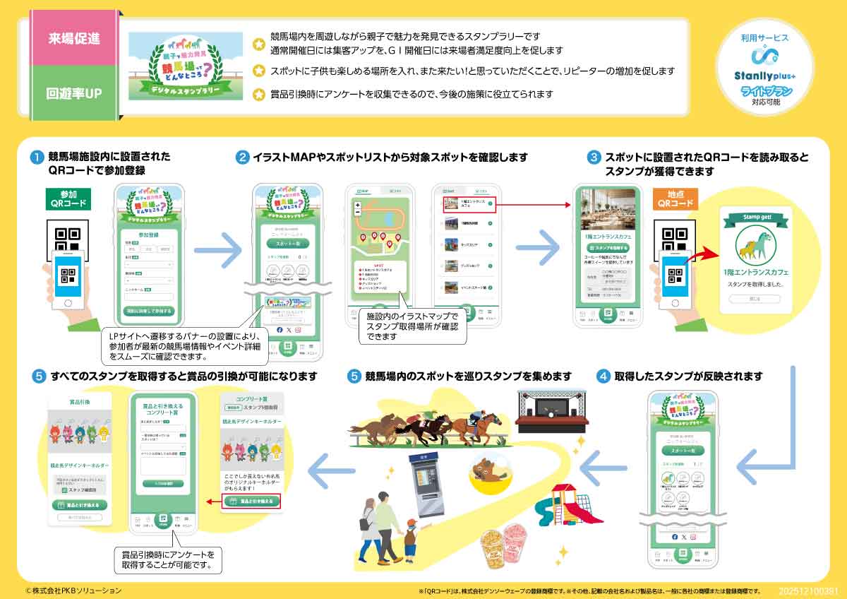 競馬場内を巡りながら、親子で楽しめるデジタルスタンプラリーです。通常開催日の集客アップを促進し、大きなレースの開催日には来場者満足度アップを促します。